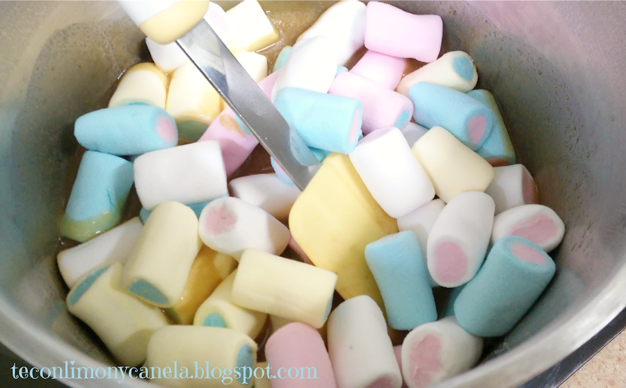 Añadimos las nubes, malvaviscos, esponjitas o como los queramos llamar, subimos el fuego y removemos durante 5 ó 6 minutos.