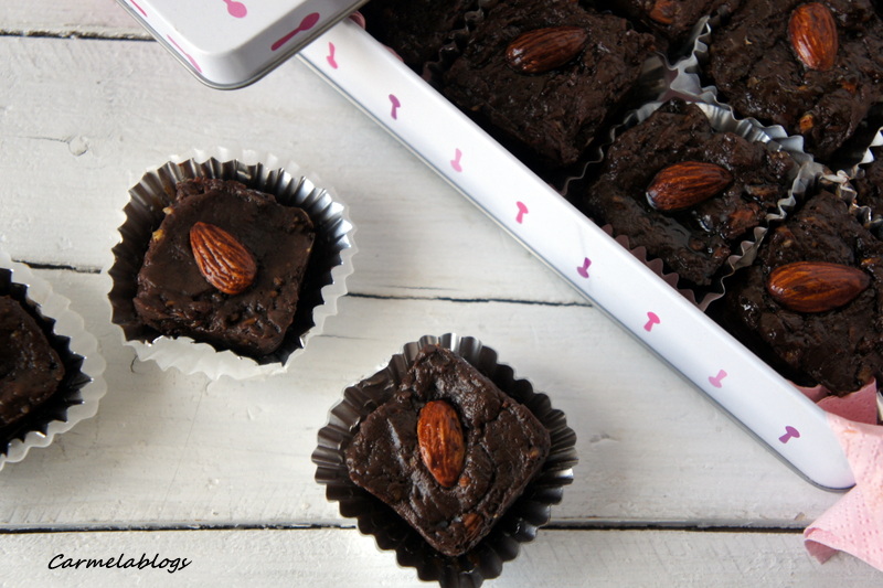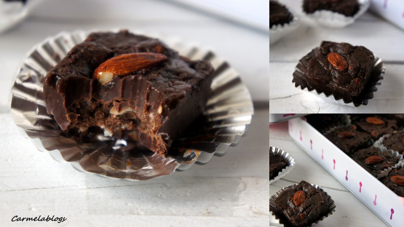 Como no se puede estar en todo con dos niños en casa, cuando ya tenía la mezcla en los moldes me dí cuenta que no había añadido el café ni la vainilla, así que para no tirarlo todo se me ocurrió pintar con la mezcla de café y vainilla los cuadrados de fudge y decorar con la almendra entera.