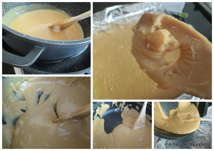 Subir el fuego, y sin dejar de remover, mantener unos 15 minutos, si teneis termómetro para almíbar debe alcanzar los 115ºC, el punto de bola flojo,veremos como salen muchas burbujas, el caramelo empieza a despegarse de las paredes y cambia el sonido, como si removiéramos arena. OJO CON LAS QUEMADURAS