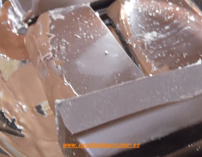 En un bol de cristal resistente al calor o de metal ( el bol tiene que estar bien seco ), introducir el chocolate troceado ( En el mercado también lo podemos encontrar en perlas más fácil a la hora de fundirlo )