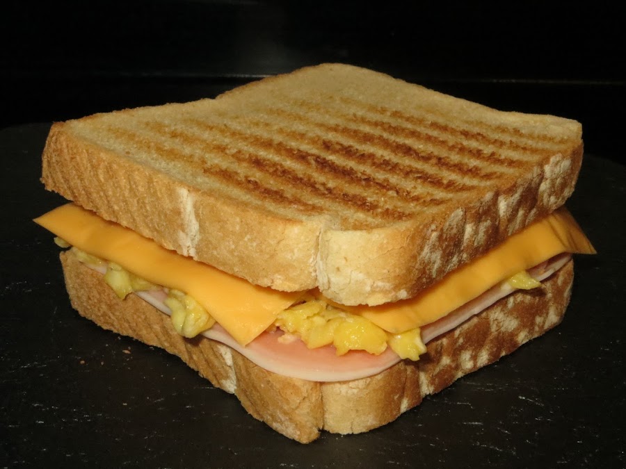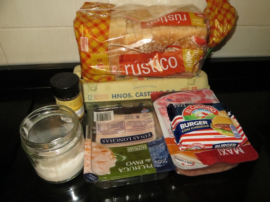 Mientras tanto vamos montando nuestro sándwich, ponemos una loncha de jamón york, otra de pavo, echamos encima los huevos revueltos y ponemos el queso cheddar para que así se derrita un poco. Tapamos el sándwich y listo para comer.