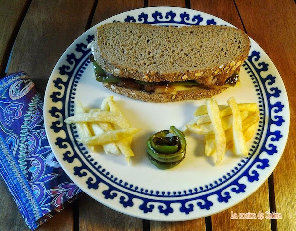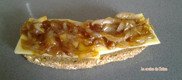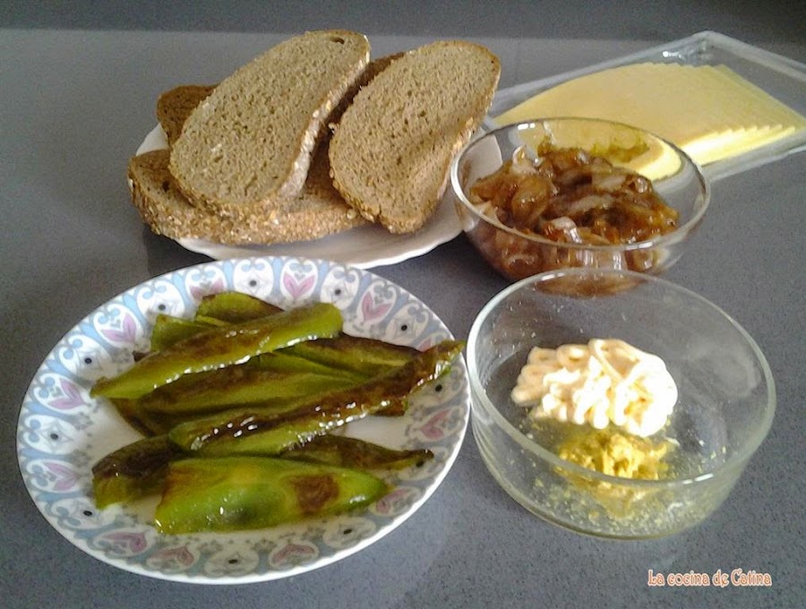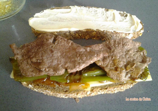 Para montar el sandwich, preparamos las rebanadas de pan, en una de ellas ponemos el queso, encima la cebolla caramelizada, los pimientos y por último los filetes.