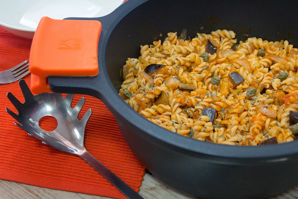 Cocemos los fusilli siguiendo las indicaciones del fabricante. Escurrimos bien y le añadimos la caponata. Ponemos al fuego y dejamos un minuto a dos para que se integren todos los sabores.