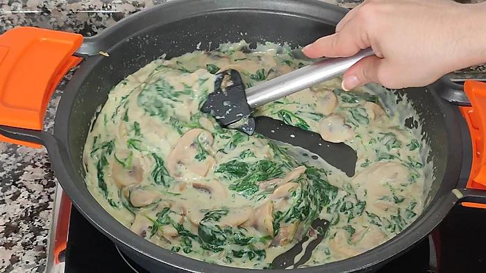 En la misma cazuela, pondremos a derretir la mantequilla. Añadimos las espinacas ya limpias.Las cocinamos hasta que hayan perdido el agua. Incorporamos de nuevo los champiñones y movemos.
