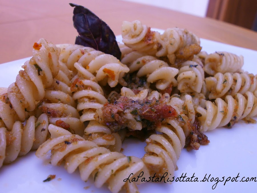 Cocer la pasta muy, muy al dente, escurrir ( reservar un poco del agua de cocción ) y terminar la cocción en la sartén con el pesto y , si es necesario, con un poco de agua de cocción.