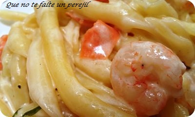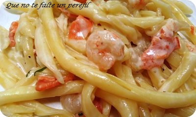 Cuando la cebolla esté doradita , añade la nata (crema de leche) . Remueve . Espera unos unos minutos minutos y cuando empiece a hervir añade las gambas . Remueve y añade los fusilli, espolvorea el perejil picado y un poco de pimienta. Rectifica de sal si es necesario.