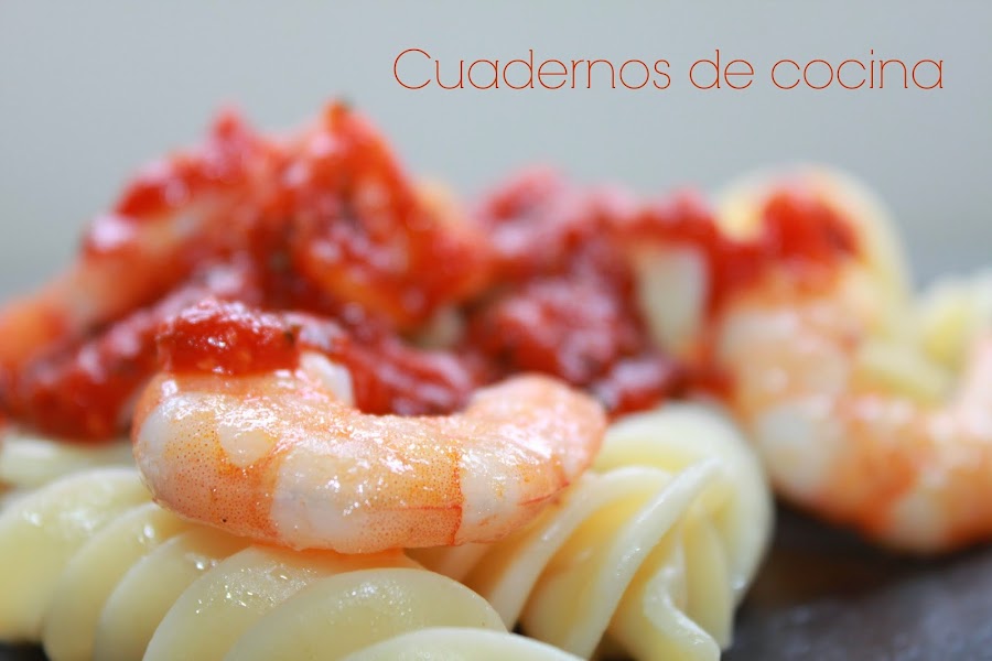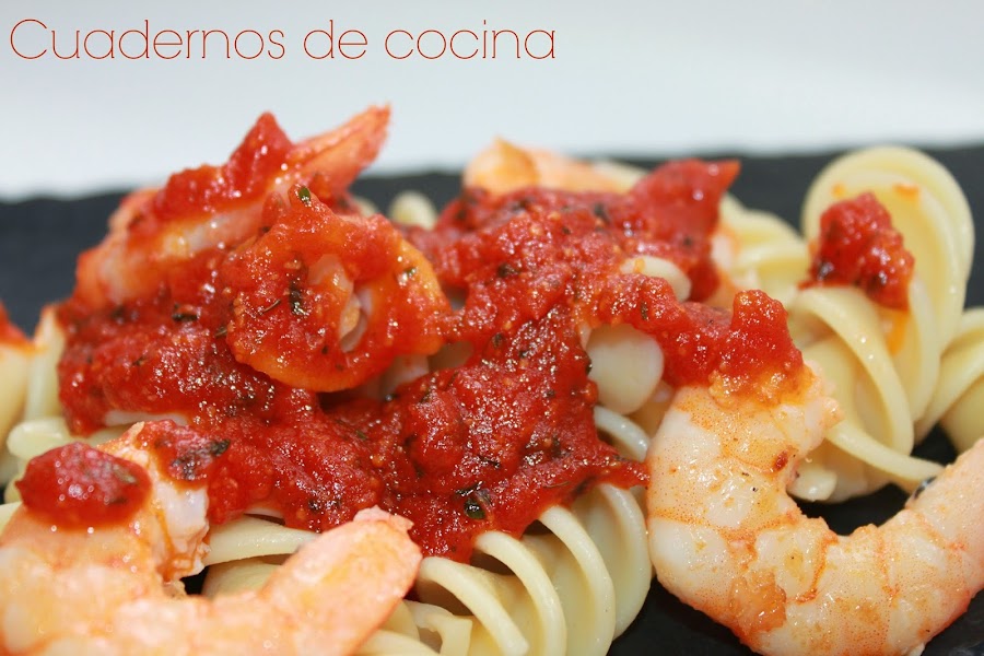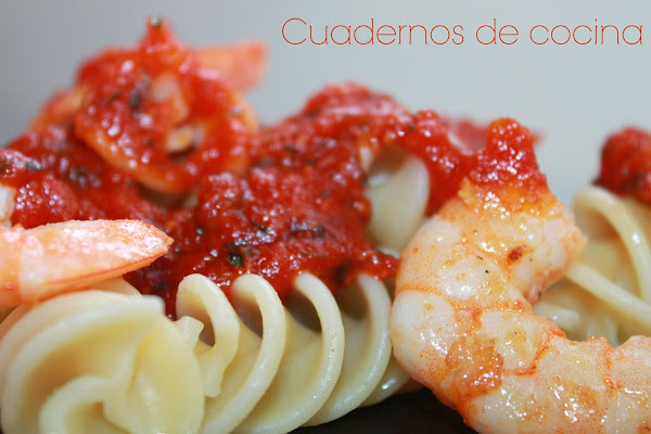 Salteamos los langostinos y ponemos en el plato junto a los fusilli. Regamos con la salsa marinera y servimos inmediatamente para evitar que se enfríe.