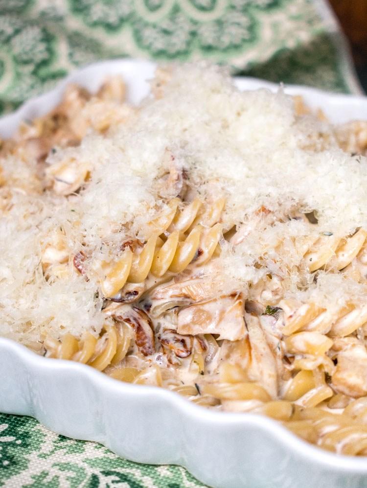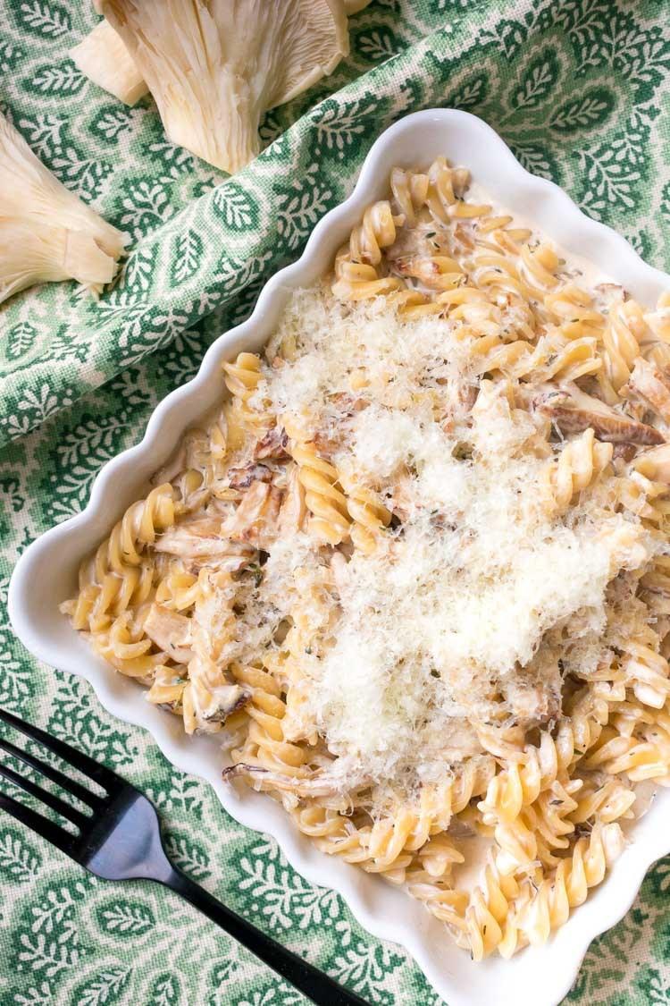 Puedes usar otros tipos de pasta, como moños, mariposa, penne o incluso fettuccini. Yo prefiero fusilli porque la salsa se mete entre los espirales, y también se mantiene caliente por un poco más de tiempo. Complementa tu pasta con setas con un poco de parmesano recién rallado y una buena baguette. ¡La cena perfecta!
