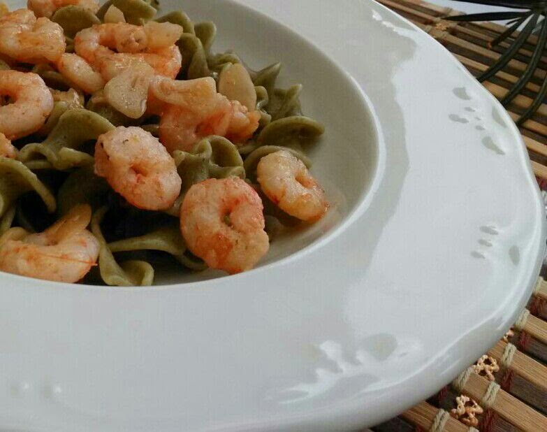 Servimos la pasta, y sobre ella las gambas al ajillo.