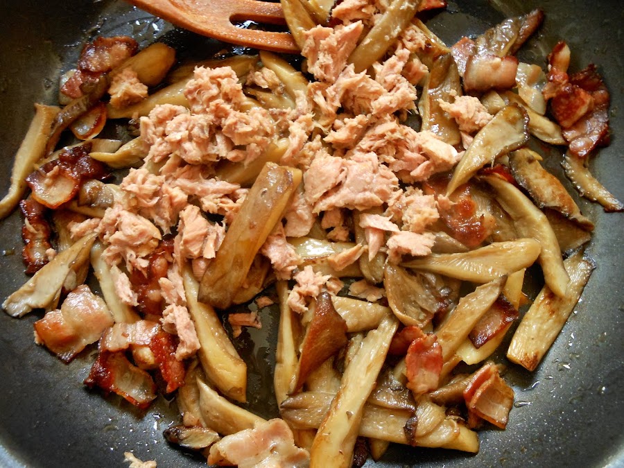 Cuando el aceite esté caliente sofríe durante 10 minutos las setas y las lonchas de bacon troceadas junto a un diente de ajo aplastado y una poquita de sal fina, removiendo de vez en cuando con tu cuchara de madera.
