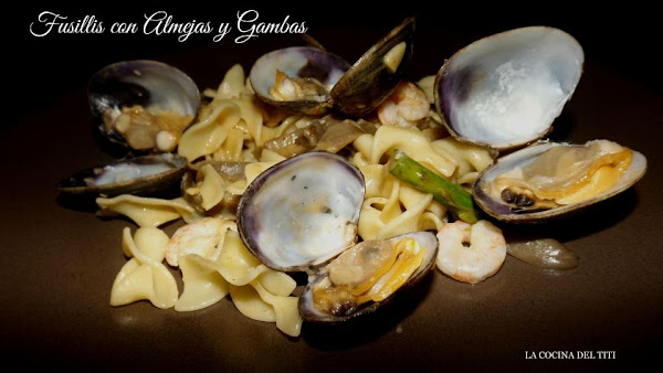 5º Pondremos las almejas y una vez empiecen abrirse le incorporamos la pasta y las gambas peladas.