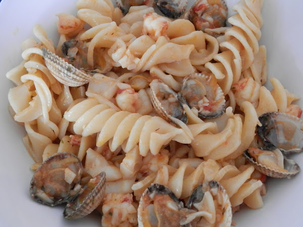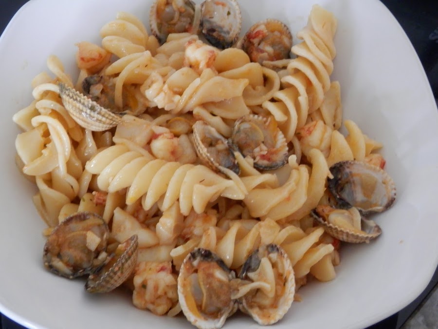 Ponemos en una olla el caldo de marisco que hemos sacado antes de las cáscaras de las gambas y completamos con agua, ponemos a hervir y cuando esté echamos los fussiloni.
