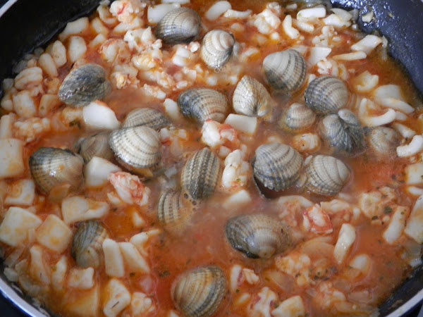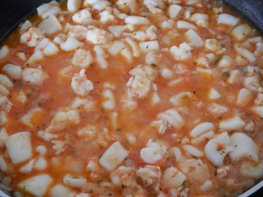 Añadimos a continuación, las gambas y los calamares y dejamos sofreír hasta que estén tiernos.