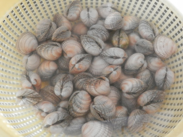 Vamos a purgar los berberechos con un puñadito de sal y abudante agua, los mantendremos allí por media hora y después sacamos y escurrimos.