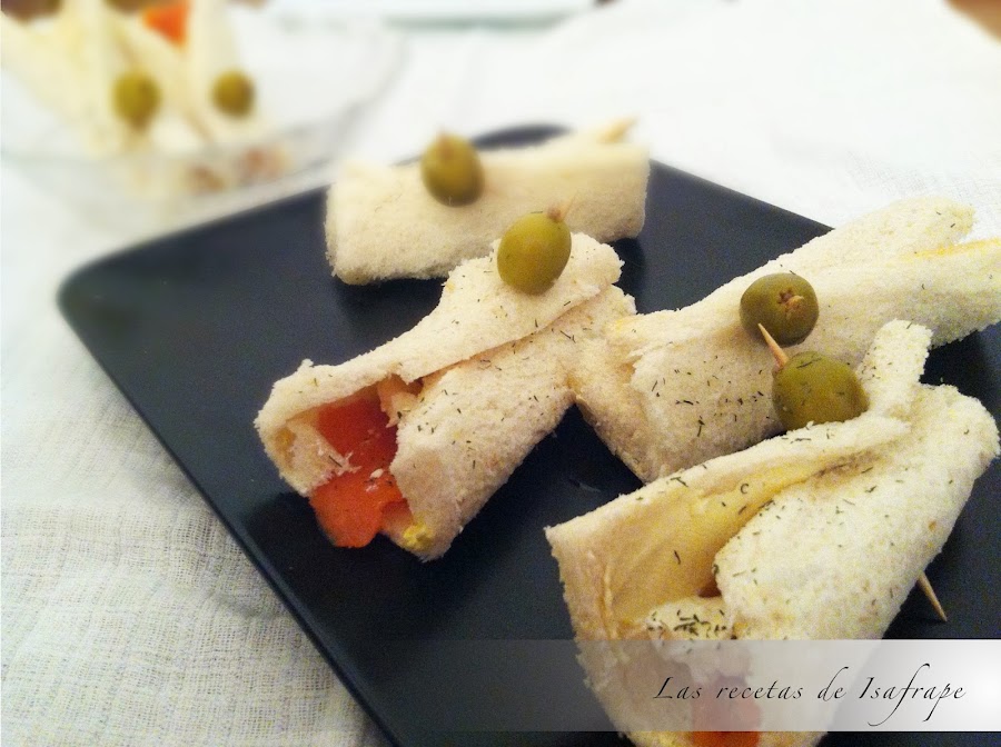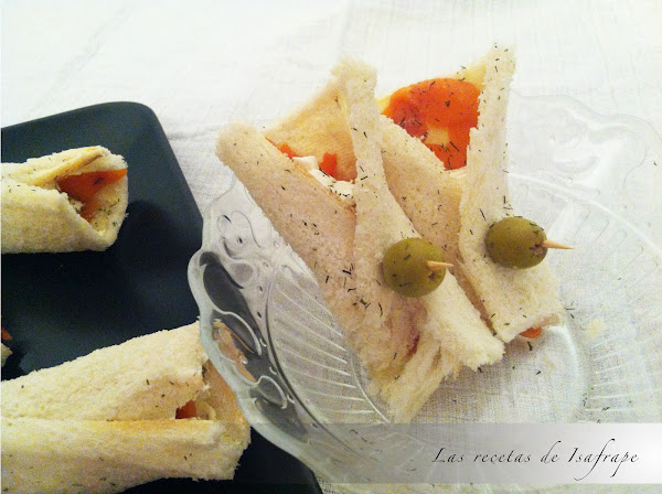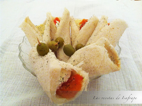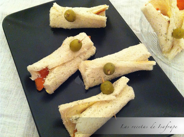 Quitamos los filos a las rebanadas de pan y les pasamos el rodillo para aplanarlas. Les untamos la mantequilla o margarina, les ponemos encima una lonchita de salmón, una cucharadita de queso crema y juntamos la zona central de la rebanada de pan a modo de paquetito superponiendo una parte sobre otra. Las unimos con un palillo con una aceituna insertada, que quede la aceituna como si fuese el cierre del paquetito. Espolvorearlos con eneldo.