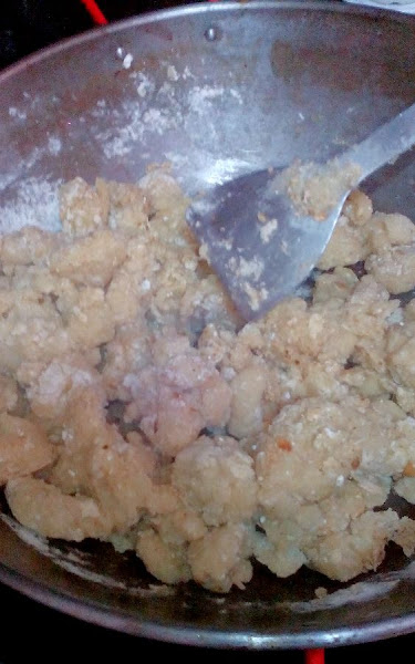 Bien, ahora hay que ir cortando, removiendo, cortando, removiendo, hasta que se formen las bolas, que primero serán mas gorditas, y cada vez se irán deshaciendo en migas más pequeñas. Es un proceso lento y pesado, hay que armarse de paciencia y hacer entreno de brazos antes, o incluso ¡tener quien te releve!