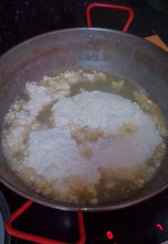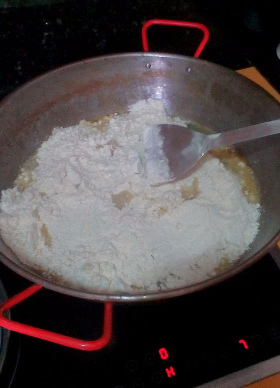 Cuando el agua este en ebullición, el siguiente paso es añadir la harina, sal y el aceite que teníamos revesado de freír el embutido. Y, con una rasera especial para migas, marcamos una cruz en la harina. Este paso es esencial para que se forme la gachamiga, o por lo menos eso me decía mi padre mientras me monitoreaba, y si lo dice mi padre, hombre de campo, va a misa.