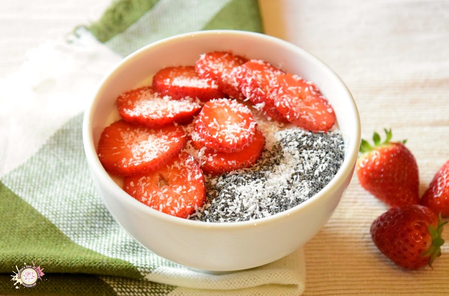 Por encima acomodamos las fresas cortadas en rebanadas, las semillas de amapola y espolvoreamos con coco rallado. Ya tenemos listo un desayuno espectacular y saludable!