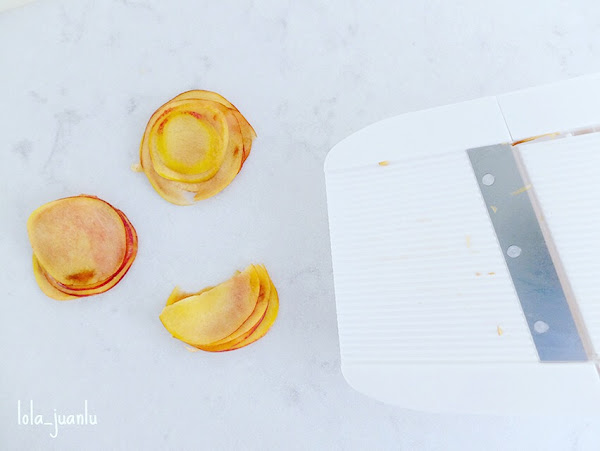 Lavamos y secamos bien la fruta. Cortamos la nectarina en rodajas muy finas. Podemos hacerlo con un cuchillo o con ayuda de una mandolina.