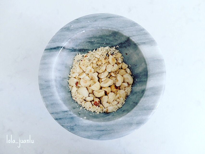 Lo primero es tener listos todos los ingredientes antes de ponernos con la elaboración. Tamizamos la harina y reservamos. Hacemos lo mismo con el cacao. Machacamos las avellanas con ayuda de un mortero.