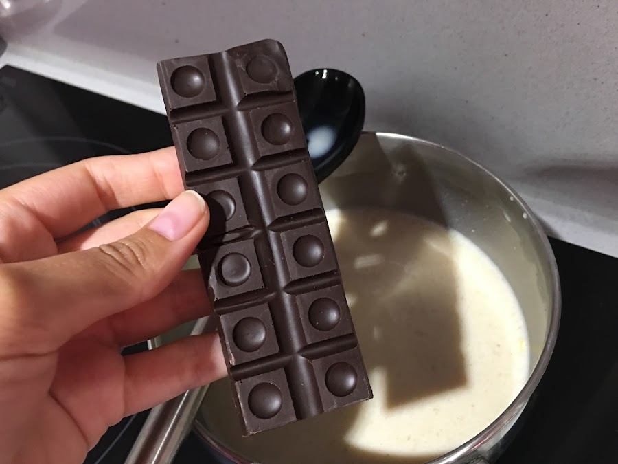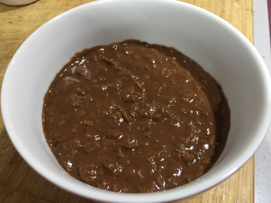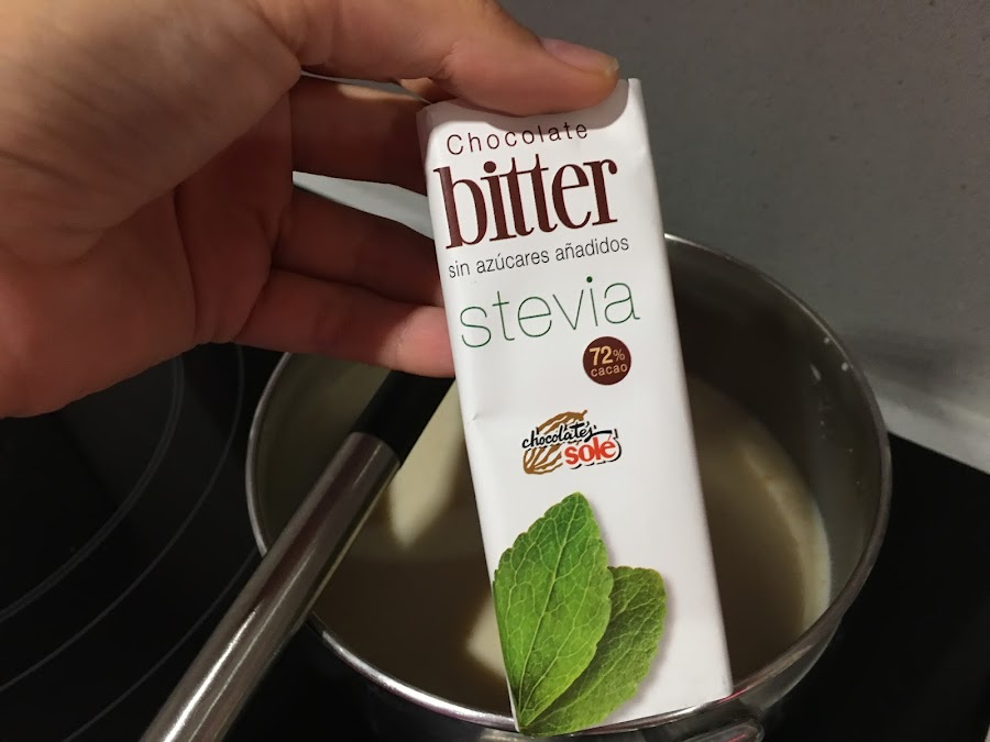 2.Cuando lleven unos 5 minutos añadimos la mini tableta de chocolates solé en trocitos. Seguimos removiendo hasta que se deshaga por completo, dando el toque oscuro a las gachas.