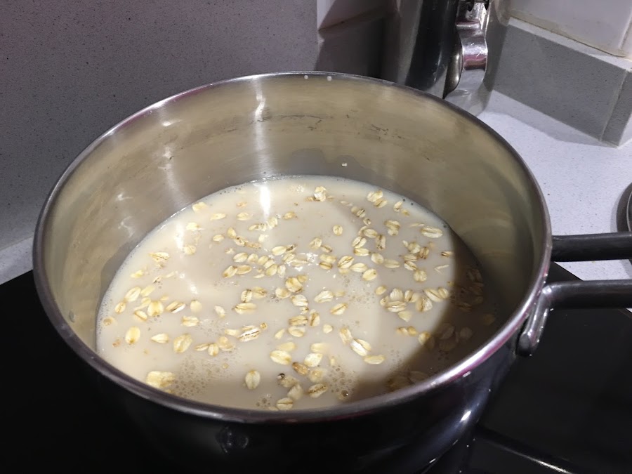 1. En una olla pequeña ponemos los 50g de copos de avena junto la taza de bebida de avena. Ponemos el fuego a temperatura media. Es importante remover constantemente para evitar que se peguen. Dejarlas entre 5-10 minutos según como os gusten de espesas. Ami me gustan espesitas, así que siempre las dejo alrededor de 10 minutos.