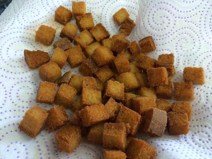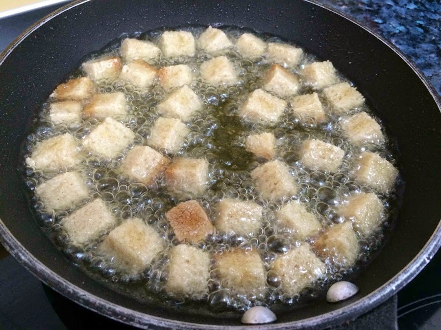 Comenzamos cortando el pan en dados pequeños y los freímos en aceite de oliva.