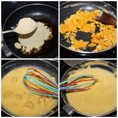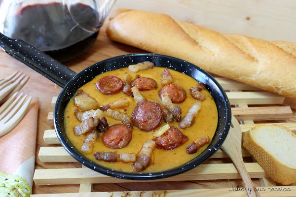 En el mismo aceite donde hemos frito la panceta y el chorizo añadimos la harina (1 cucharada sopera por persona), la rehogamos un poquito, e igual que cuando hacemos bechamel, vamos echando agua poco a poco mientras removemos para que no queden grumos.