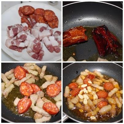 Cortamos la panceta a trocitos y la freímos en ese mismo aceite , cuando esté casi hecha añadimos los chorizos y los ajos picados o enteros. Cuando estén dorados , sacamos todo del aceite y lo reservamos.