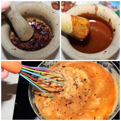 Machacamos el pimiento seco frito y los ajos en un mortero, le ponemos un poquito de agua y se lo añadimos a las gachas junto con la guindilla si las queremos picantes y sal al gusto.