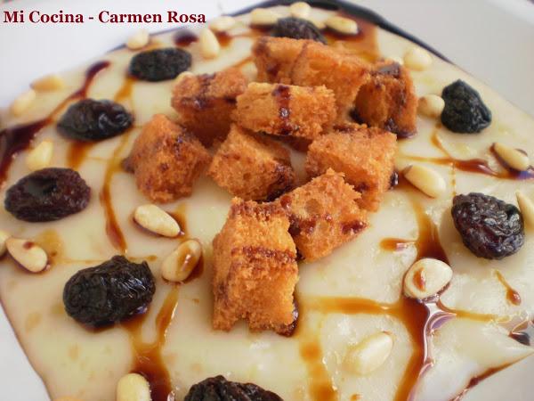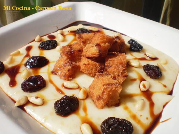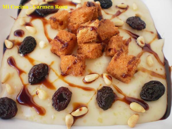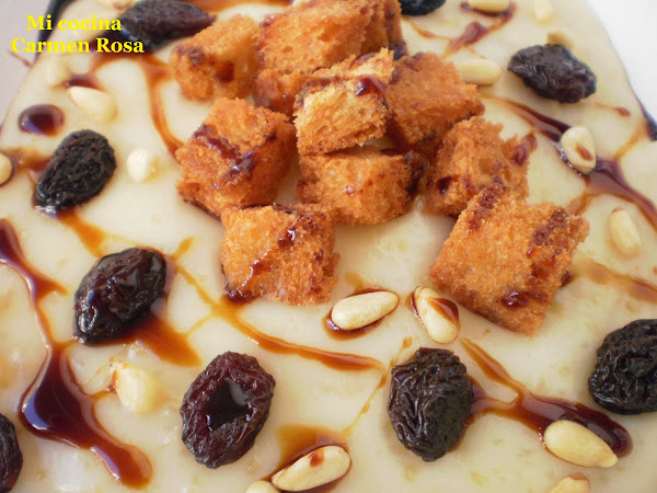 Colocar encima el pan frito, los piñones, las pasas y echar azúcar de caña por encima.
