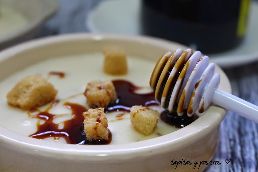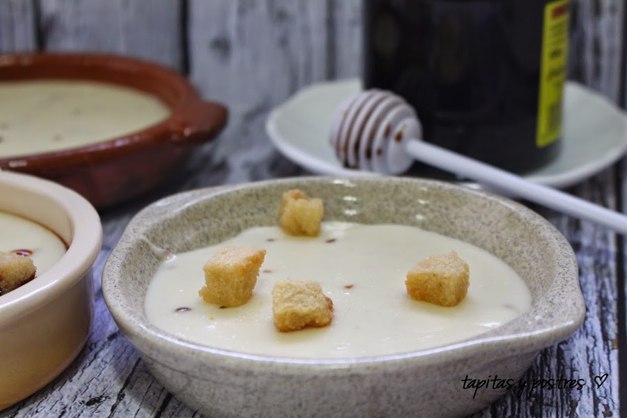 Vertemos sobre los recipientes que hayamos elegido y adornamos con picatostes y un hilo de miel de caña.