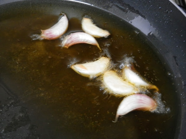 Echamos en una sartén grande unas cuatro cucharadas de aceite de oliva y un par de cucharadas de pringue y un poco de sal,calentamos y sofreímos un poco los ajos hasta que empiecen a tomar color.