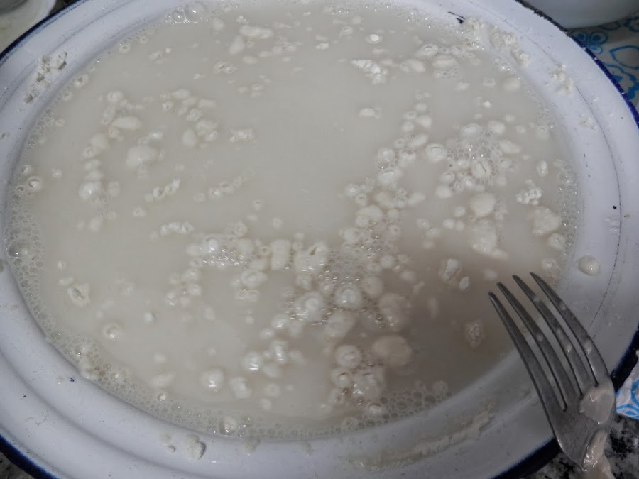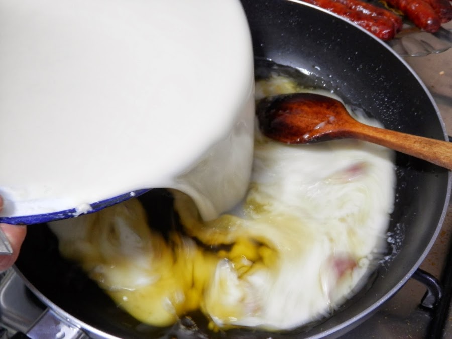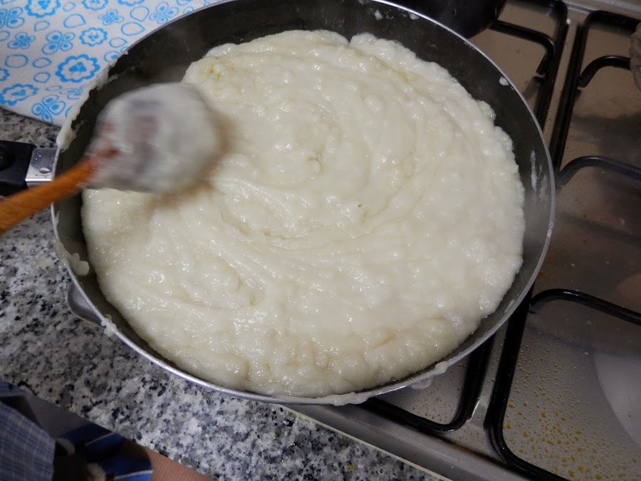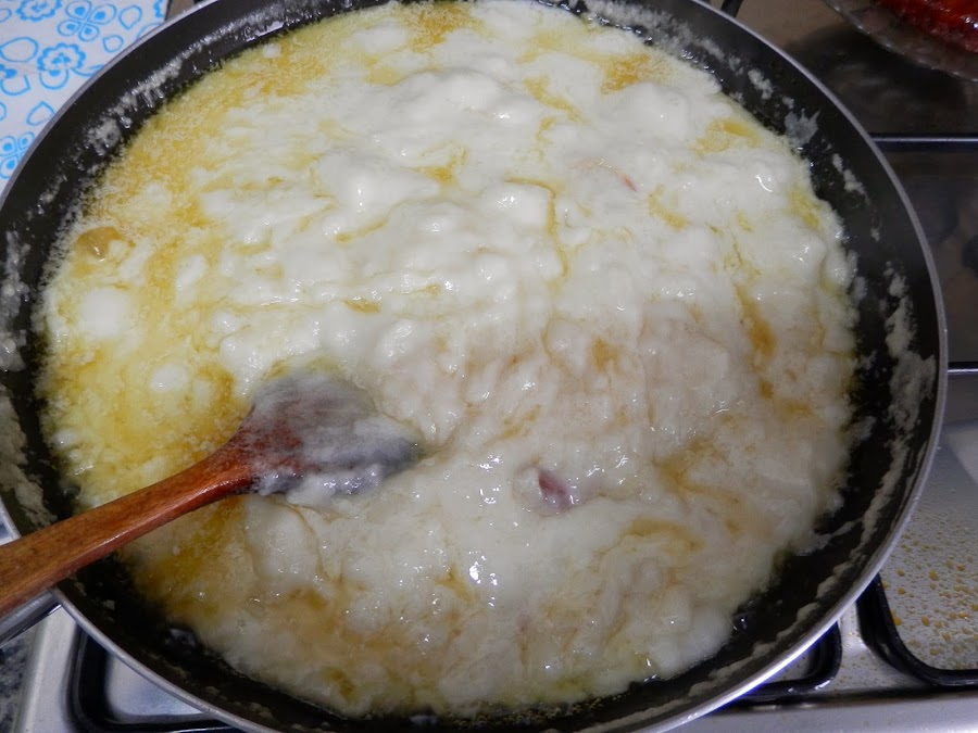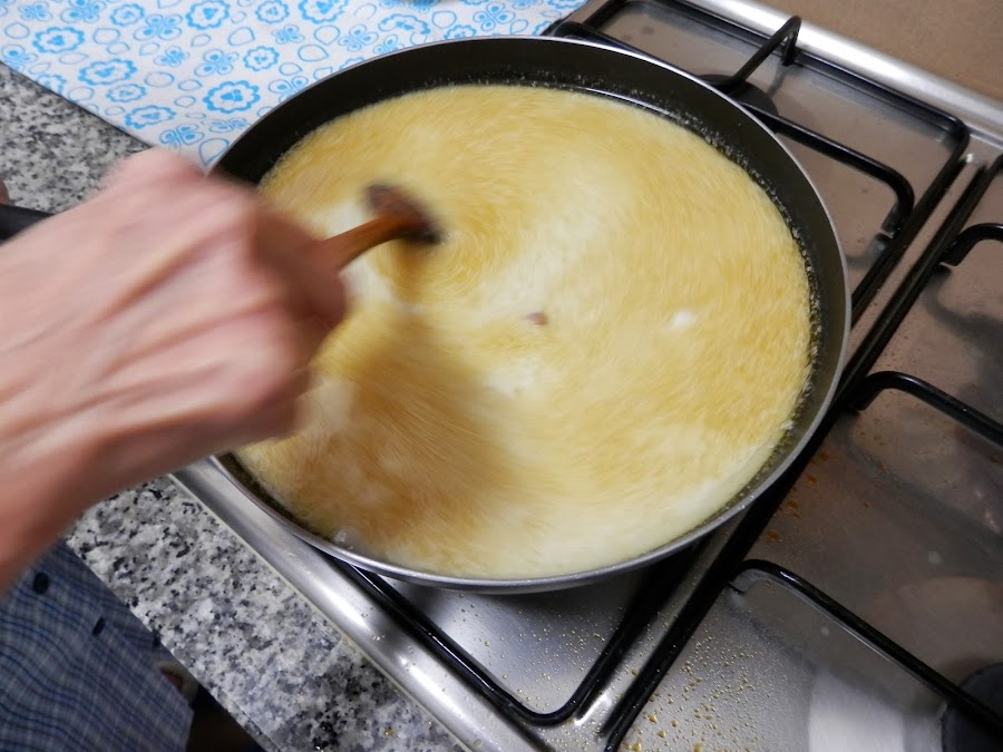 Cuando la mezcla va tomando calor, va empezando a cuajar poco a poco, hasta que toda el líquido pase a tener la textura de una bechamel espesa.