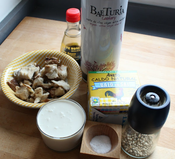 Añadimos, la soja, y el caldo, he utilizado uno de pollo, bajo en sal, de Aneto. RiKo, riko. Y así con la soja.... no se nos pasa de sal.