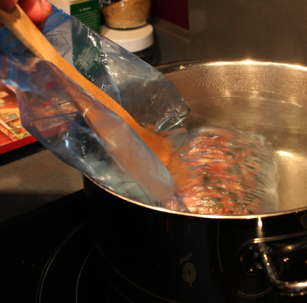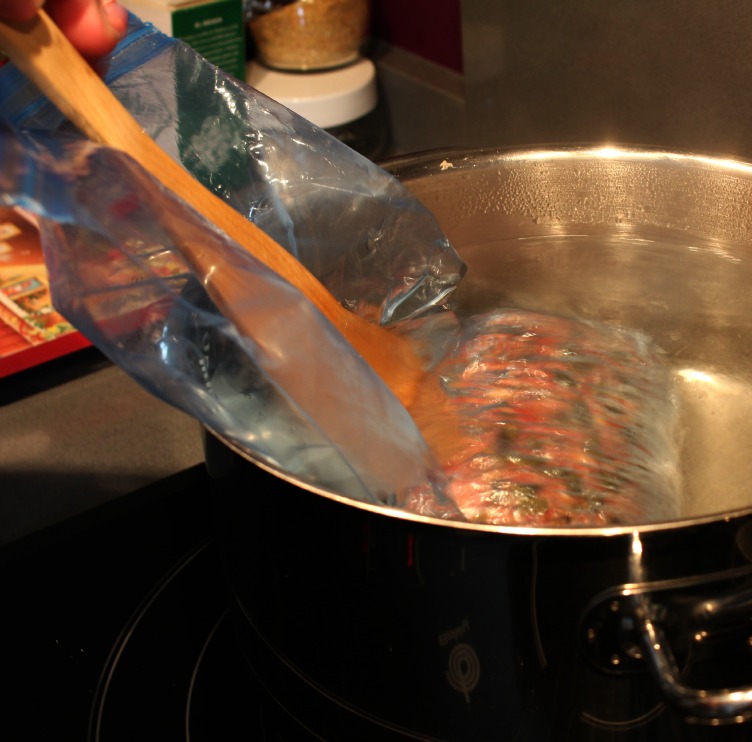 Cazuela grande llena de agua. En el momento que empiece a hervir, metemos la bolsa, con cuidado de que no nos entre agua dentro.
