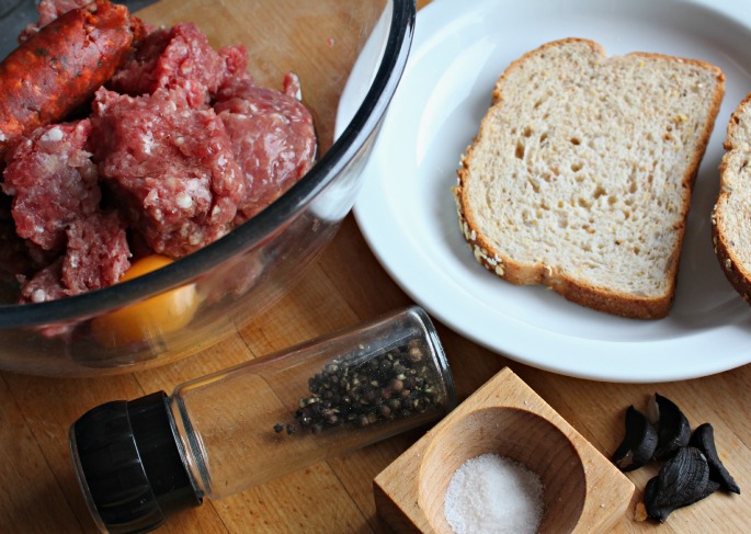 Mientras, en un bol grandote, ponemos la carne picada, el chorizo sin su piel, el pan de molde bien desmenuzado (si quieres puedes mojarlo en leche o en el huevo batido), el huevo, los ajos negros picaditos, pimienta y sal.