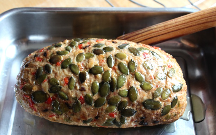 Gratinador a 200º. ¿Si?. En una fuente de hornear, colocamos la galantina ya cocida y la pintamos con aceite.