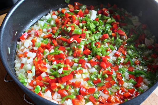Con las verduras troceadas, ponemos un poco de aceite en la sartén y hacemos un sofrito. Fuego medio, sin prisa.