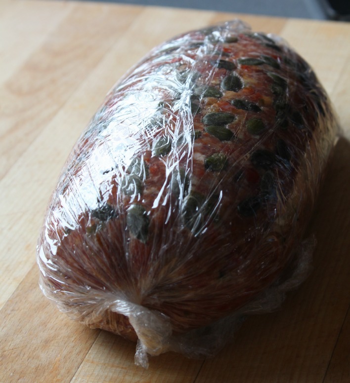 Ponemos toda la carne sobre un papel film, grande. Y vamos a intentar hacerlo un tronco.