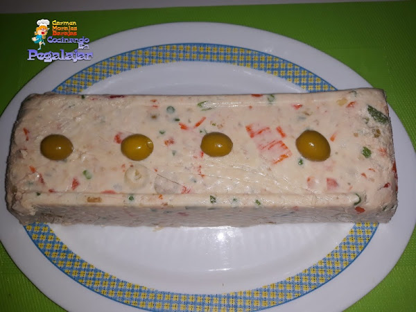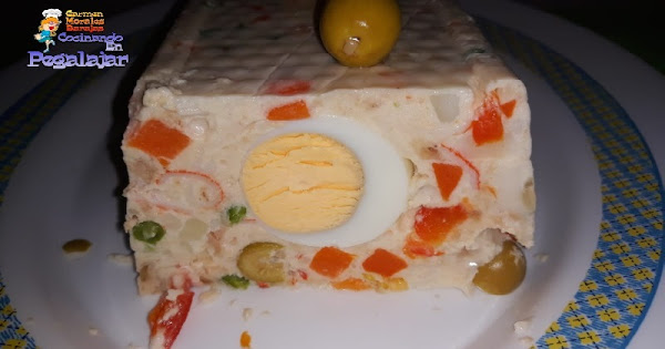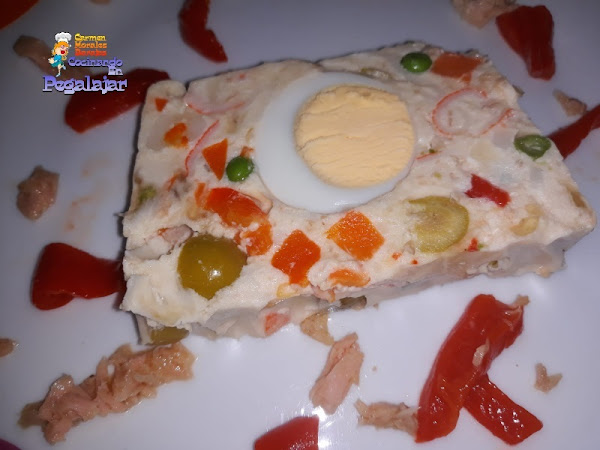 A la hora de desmoldarlo, tan solo hay que ponerlo boca abajo todo el conjunto se ha solidificado y forma un buen bloque que se puede manejar sin dificultad. Cubrirlo por encima y por los lados con Mahonesa y decorar al gusto