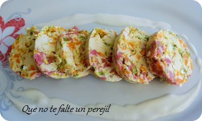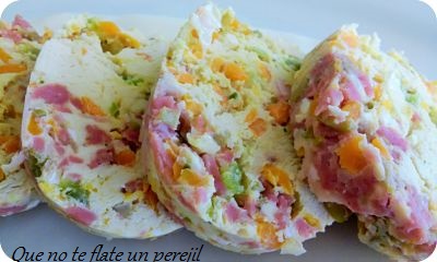 Yo he elaborado una "galantina" más sencilla, pero resultuna, fácil de elaborar, con vivo colorido y que será un acierto en la mesa. Ideal para bocadillos donde podremos agregar lechuga , tomate y mahonesa , por ejemplo.