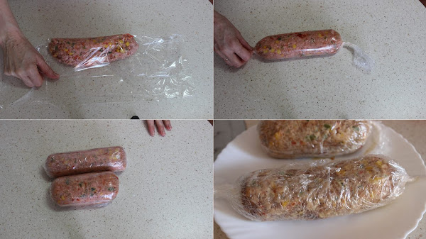 En una bol ponemos la carne, añadimos los pimientos picados, el maíz dulce escurrido, sal y pimienta molida al gusto y el huevo.