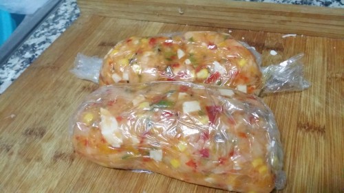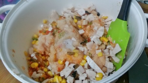 - Volvemos a poner todo el pollo en el vaso y añadimos el maíz dulce, los pimientos picados, dos cucharaditas de sal, un poco de pimienta. Mezclamos 10 segundos, velocidad 3, hasta obtener una masa homogénea.