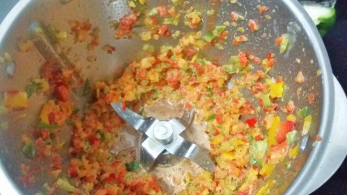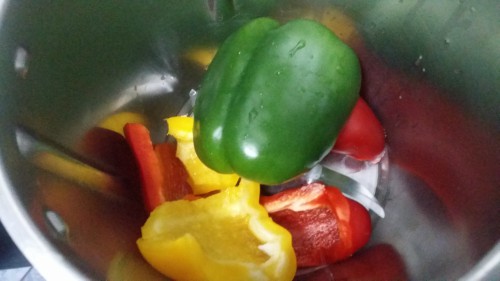 - En el vaso de la Thermomix, echamos los pimientos cortados en trozos grandes