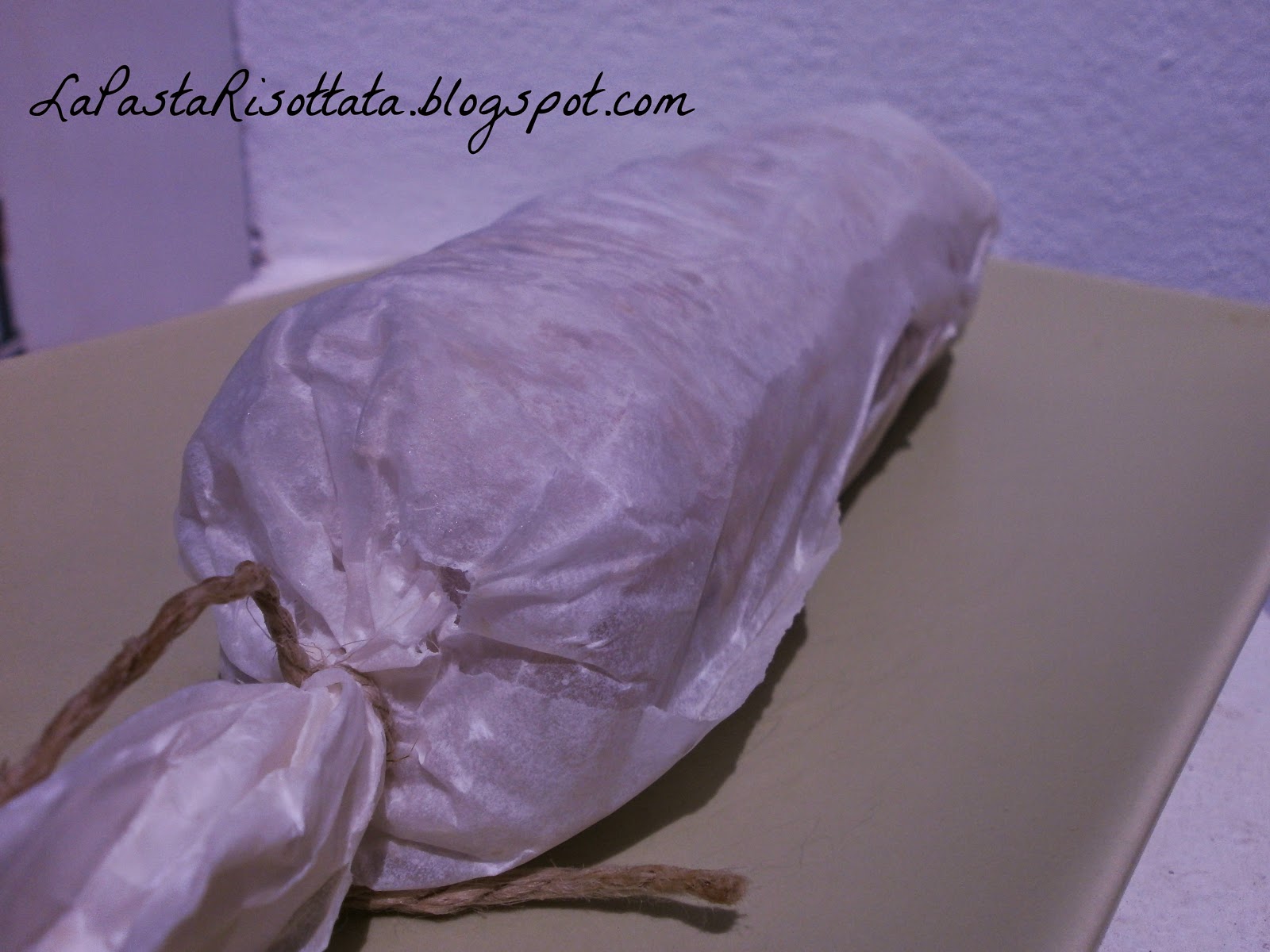 Formar un cilindro del diámetro de unos 8 cm y envolver con el papel. Atar los extremos con hilo de cocina. (el papel, mojado, tendía a romperse entonces lo he ulteriormente envuelto en papel de aluminio)