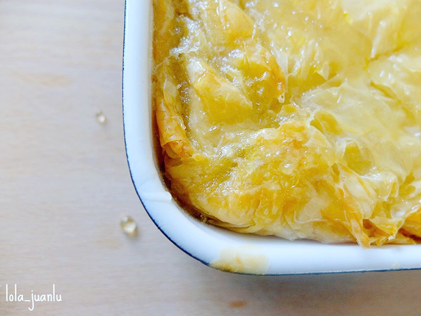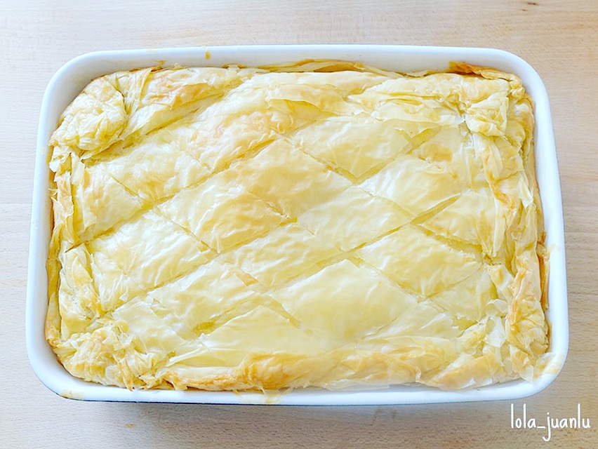 Una vez tengamos la fuente cubierta por 13 hojas de masa filo, vertemos la crema y repetimos el proceso anterior con otras 8 hojas más de pasta filo en la parte superior, esta vez colocándolas dobladas por la mitad.