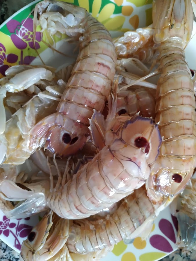 Las galeras normalmente se utilizan para dar sabor al fumet, pero la verdad es que cocidas, a la plancha o así en tempura están buenísimas, tienen un sabor super intenso a marisco, es una mezcla de cigala con toque de mejillones, puesto que se alimentan de ellos.