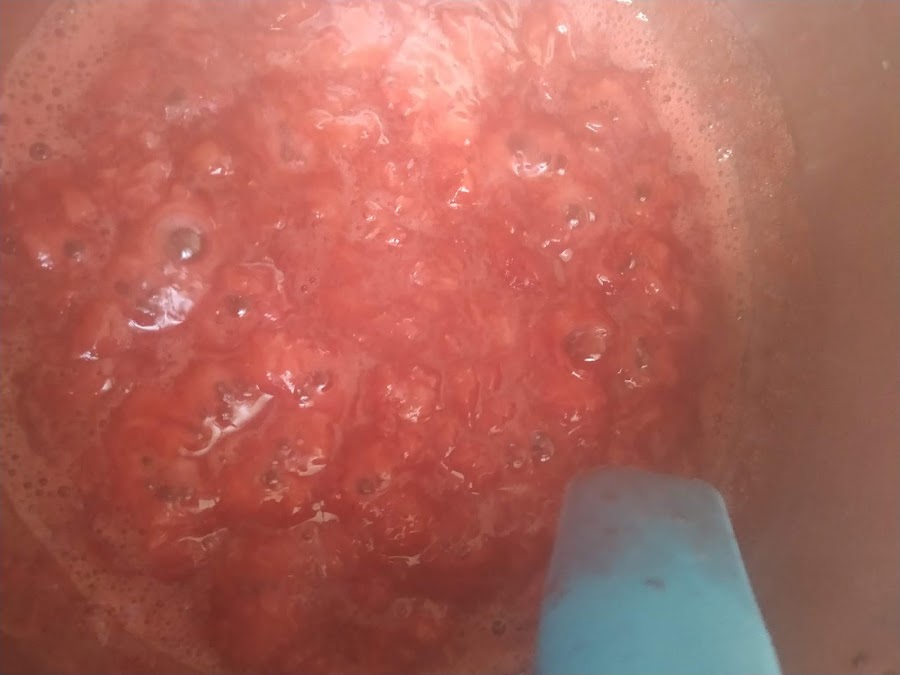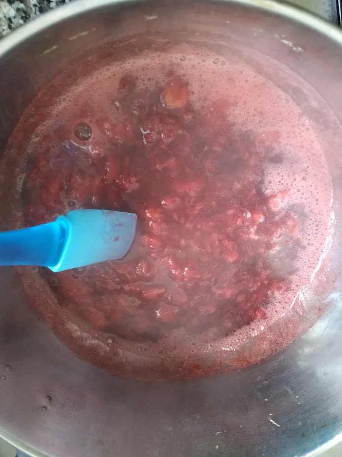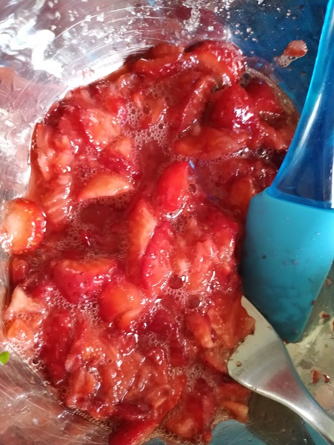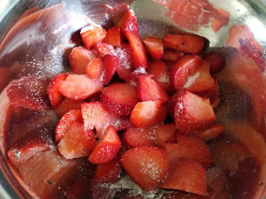 Por otro lado troceamos y chafamos un poco las fresas, añadimos el azúcar y las ponemos en una sartén al fuego.