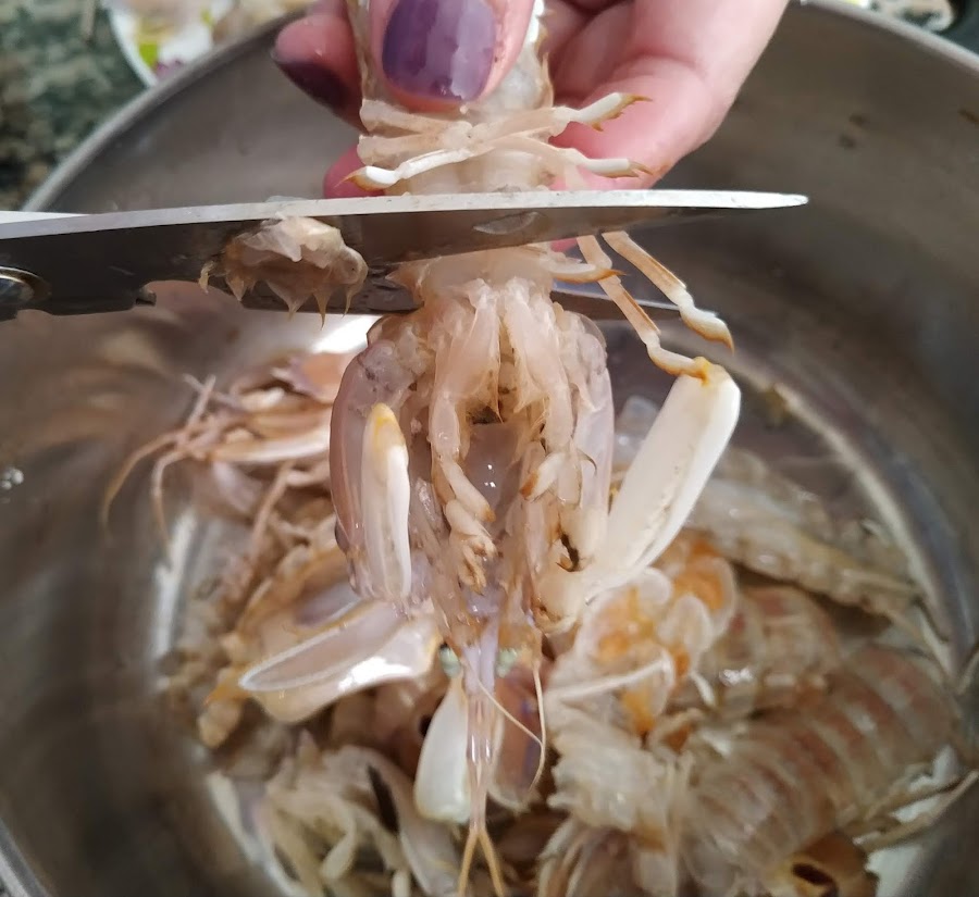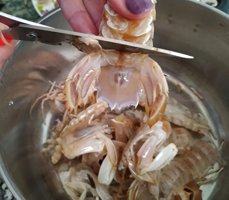 Lo primero que hacemos es limpiar las galeras. Para ello, cortamos la cabeza y las colas y hacemos un corte en el cuerpo de arriba a abajo y sacamos el cuerpo con cuidado. Guardamos las cáscaras para hacer un fumet que podremos usar en otras elaboraciones.